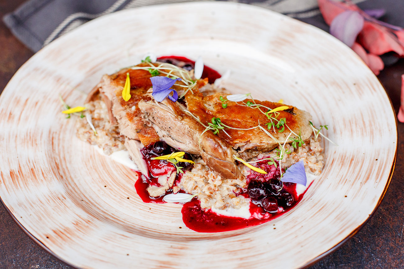 «Утка с гречотто» подается с двумя соусами – из лесных ягод и со сливочным хреном.